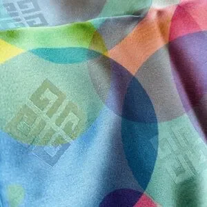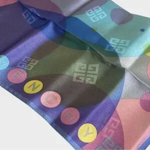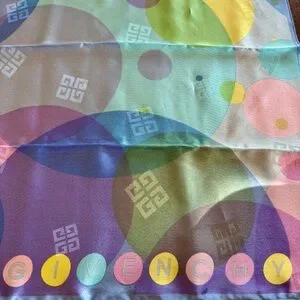 This is a beautiful Givenchy silk scarf featuring a colorful bubble or circle pattern with the signature 'G' logos integrated into the design. What an amazing EASTER gift to your favorite gal or guy who loves pastels. It’s stunning and on the smaller side.