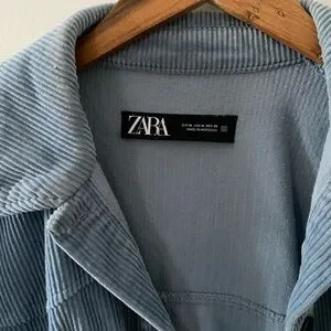 Chic light blue corduroy shirt jacket by Zara. Features button-up front, dual chest pockets, and side pockets. Ideal for casual wear. Size medium, minor pilling in interior (can be noted in tag photo) but no signs of wear to exterior.
