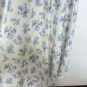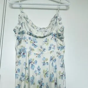 Charming sleeveless dress featuring a floral pattern. Blue and green accents on a white background.