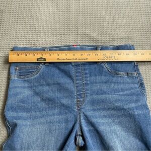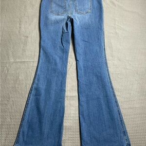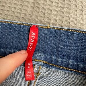 Womens Spanx high rise flare jeans, vintage indigo medium wash, size large. Pull on style, slimming inner front panel. Lightly worn, very good condition, very slight back bottom edge distressing. Please see pictures for details and measurements.
