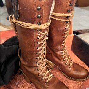 Step out in style with these brown leather lace-up boots. Perfect for any occasion, they offer both comfort and elegance. Worn a few times comes with original box and dusters.