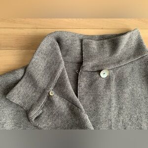 Architectural knit jacket from Italian studio Z Studio featuring an asymmetric button closure, high structured collar, and a clean minimalist silhouette. Heavyweight compact knit with a tailored, modern feel — can be worn as a light jacket or statement cardigan.