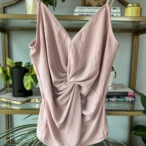 This dusty rose top is fashioned with a gathered, twisted front detail for a femme touch and peplum style back! Has adjustable spaghetti straps and elastic back waist.