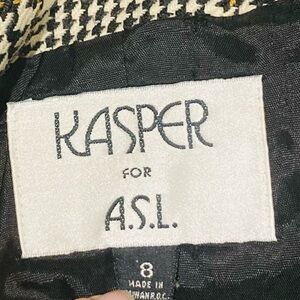 Vintage 80s black and tan houndstooth plaid blazer. Double breasted with black and gold buttons. Scoop or round neckline. Wool blend. Fully lined. Size 8