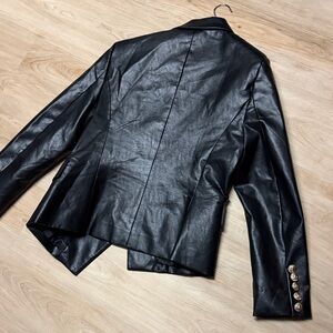 Sophisticated double breasted black leather blazer. Features striking gold buttons. Ideal for elegant events.