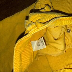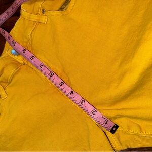 Cato Denim Sunshine Yellow Distressed Skinny Jeans - sort of a golden yellow mustard yellow color. Measurements shown in photos. Really great condition other than a small imperfection on the left leg that if you further distress or cuff you wouldn’t see - honestly I wore with boots so I didn’t notice either. Size 12 Petite hi rise - you already I got them to go with my Steeler’s jersey! lol perfect for that or with a green sweater for Green Bay!
