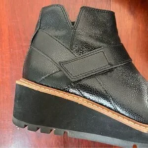 Cargo ankle booties from Eileen Fisher in a shiny crinkle black leather. Adjustable Velcro straps. Lug sole.