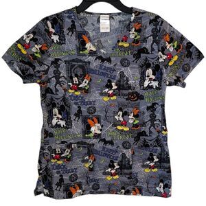 Disney small Halloween smock featuring Mickey and Minnie Mouse graphics with functional front pockets. Lightweight and practical — perfect for nurses, daycare workers, retail, or any festive workplace during the Halloween season.