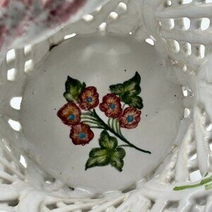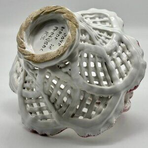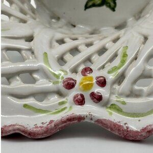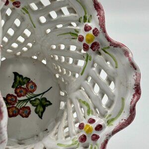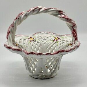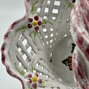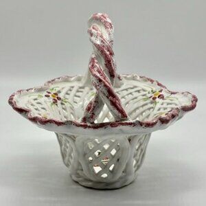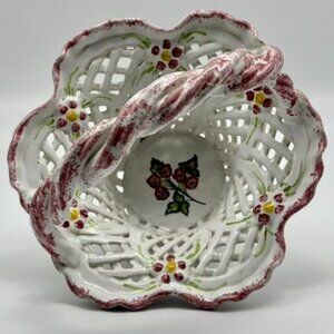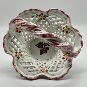 This lovely artisan-made ceramic basket by Berardos Portugal exhibits excellent craftsmanship with a delicate lattice design, hand-painted floral accents, and a twisted handle. The handle and the scalloped edged rim also have mauve/rose colored sponge pattern details. Ideal as a centerpiece or decorative item, the basket combines elegance with timeless charm, showcasing its artisanal quality. 6-1/4 inches tall by 6 inches wide. Some minor wear on the inside visible, no cracks or chips.