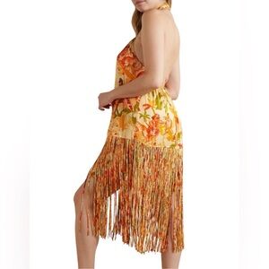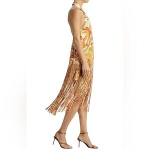 Farm Rio Anthropologie Leopard Forest Sand Mini Dress w/Long Fringe Trim, Halter Style, Elastic Waist in Back, Length of Mini Dress From Top of Bodice 28", Length Including Fringe 52" No Flaws. Vibrant floral dress with fringe details.