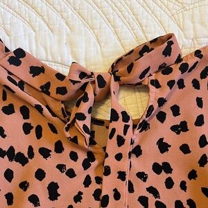 Stylish leopard print blouse by Papermoon. Features bold black spots on a pink background and a tie in the back. Perfect for casual or dressy occasions.