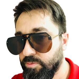 Stylish aviator sunglasses designed for men, featuring a modern rimless design. These shades offer a fashionable look with their unique shape and sleek construction. The brown lenses provide excellent clarity and protection from the sun, making them ideal for driving, outdoor activities, or everyday wear. The gold-tone arms add a touch of sophistication to the overall design. Perfect for adding a cool edge to your casual outfits, these sunglasses are great for weekend outings, beach trips, or simply cruising around town.