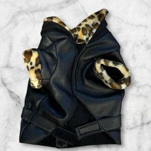 Stylish black faux leather dog jacket with leopard print fur trim. Perfect for keeping your pet warm and fashionable. Velcro closures, adjustable around the waist. Pit to pit 12”, 24” circumference. Length from shoulder to center back 12”. Collar is 13”
