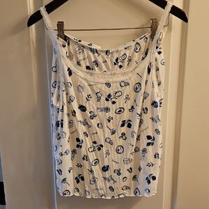 Perfect for channeling those Mediterranean vacation vibes. This set features a ribbed cami tank with delicate lace trim and matching shorts, both in a fun Euro-themed print with tiny lemons, sardines, shells, and boats on a crisp white background. In great pre-loved condition, ready for cozy nights in or lazy mornings. Super soft and comfy!