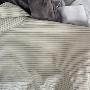 Color is hard to get in my lighting but is a green in color and closest to up close photos. It is wrinkled and needs an iron but only have a steamer 😅