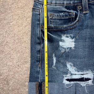 Classic blue denim shorts. Features low rise fit. Ideal for everyday style.