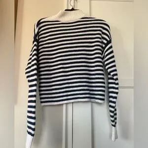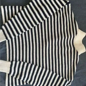 Chic striped turtleneck sweater by Madewell. Features a classic black and white pattern. Ideal for layering and casual wear.