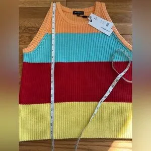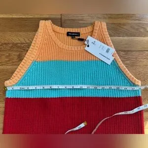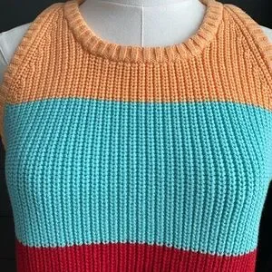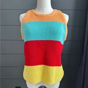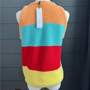 New with tags 525 America cotton sleeveless tank/crewneck wide multicolor striped shaker sweater. Ribbed knit bold color block with orange turquoise, red and yellow stripes. Sleeveless and stylish. Ideal for spring and summer.