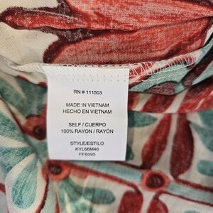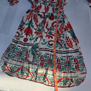 This Anthropologie dress is a perfect addition to your wardrobe. The dress features a beautiful floral pattern, collared neckline, and button closure. The knee-length dress is made of a lightweight viscose and linen blend fabric with a canvas texture. The dress has 3/4 roll tab sleeves, curved shirt hem, and small side slits. It comes with a belt to cinch at the waist and create a flattering silhouette. The dress is perfect for any occasion, from casual outings to weddings and parties. It is machine washable, making it easy to care for.