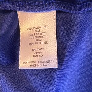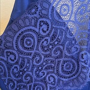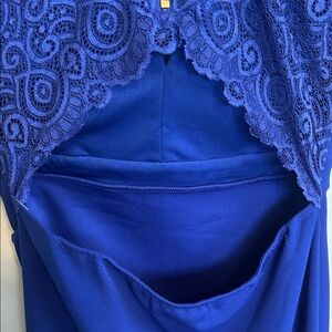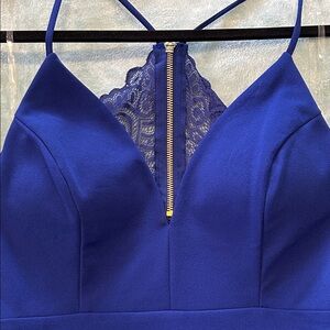 Chic asymmetrical dress in royal blue. Features a lace back accent. Perfect for special occasions.