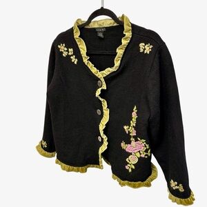 Tally Ho vintage black wool embroidered cardigan sweater with velvet ruffle 1X