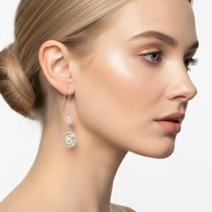 Matte Rose Quartz Moon Star Drop Earrings Silver Tone