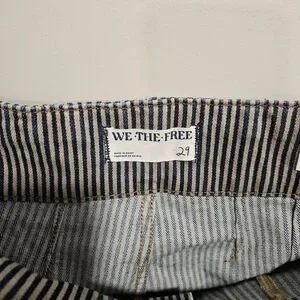 High waisted pin-striped #flared jeans by We The Free. Blue and off white train car stripe pattern. Perfect for #Coachella, vintage look.