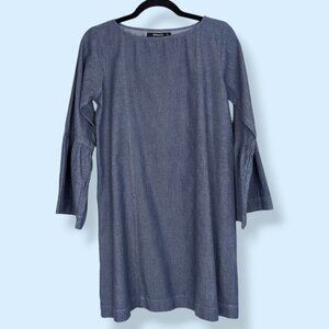 This dress by Khaadi is made of a 100% cotton soft blue denim fabric. The dress has a round neckline and long sleeves with wide, flared ends that flare out around the 3/4 length mark. The hem falls around the knees and there is subtle darting throughout. The fabric has a little stretch to it and the intended fit is a little looser, so there is no zipper or button opening anywhere. The dress has normal wear and is very comfortable, and there are no issues affecting wearability.