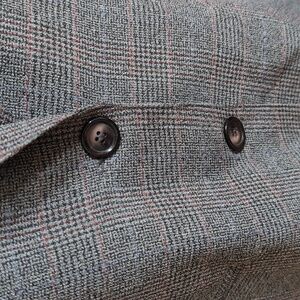 Chic gray/red plaid blazer with a stylish black soft suede notched collar. Two button closure. There are shoulder pads which appears easy to snip out if you don't care for them. Ideal for work or casual outings. Chest measures 24 inches armpit to armpit across the front. Length shoulder to hem 29 inches. Made in the USA. Machine washable!