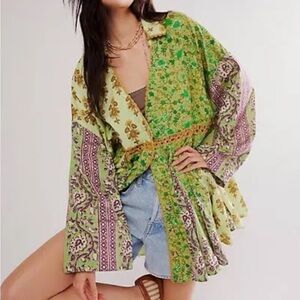 Free People Hazy Baby Printed Mini Dress Green Tunic Top Shacket Kimono Sz L NEW