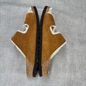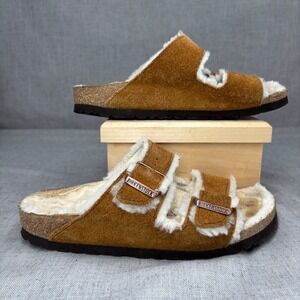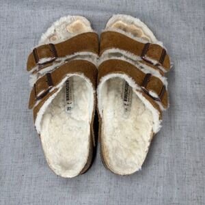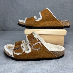 Birkenstock Arizona Shearling Suede Tan Leather Slides Sandals Women's EU 36