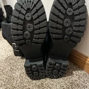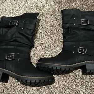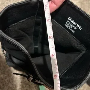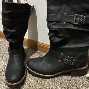 Stylish black wide calf moto boots with buckle details. Not quite knee high but hit about mid to upper calf on me. Durable and versatile for any outfit. Size 9.5, opening circumference roughly 5.5 inches, I have very thick calf’s and these fit me perfectly just cleaning out the closet. Still being sold on Amazon