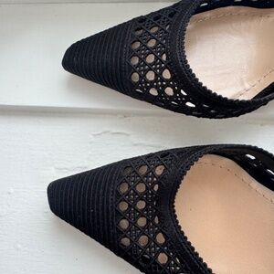 Refined and timeless black slingback heels featuring a pointed toe and delicate mesh cut-out design. Crafted with a feminine silhouette, these shoes offer a perfect balance between elegance and modern sophistication.