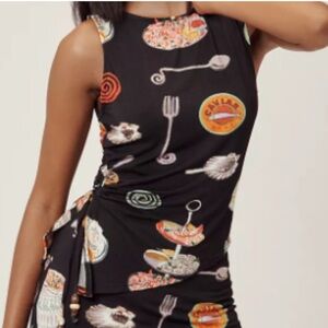 The Erin Tank is a form fitting, sleeveless tank top with side ruching tie details with wooden beads and an asymmetrical hem. Featured in our signature Caviar Dreams print in black.
