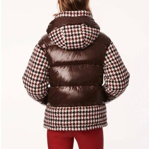 Stylish puffer with checkered pattern. Features warm hood and zip closure. Ideal for cold weather.