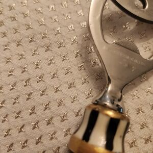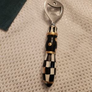 Stylish bottle opener with a black and white checkered handle and gold accents. gold trim has been updated