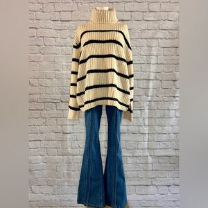 Handmade Turtleneck Pullover Sweater Cream Black Striped Oversized Cozy Casual