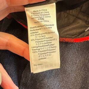 Wool-blend A-line mini skirt in a red and black buffalo check pattern. It is a classic, lined mini skirt that features a back zip closure and is made of a wool and polyester blend.