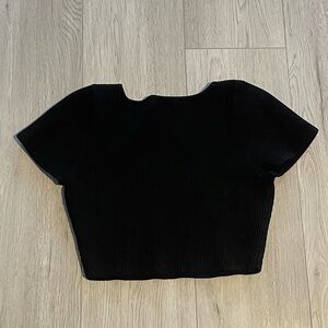 Babaton Sculpt Knit Squareneck Top from Aritzia, in black. Cropped shirt in a sculpting rib knit fabric with short sleeves, a fitted silhouette and a squared neckline.