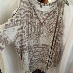 Stylish tie-dye cold shoulder top with a unique pattern. Tag is partially gone but I know it fits 2xl no issue with lots of stretch. Super soft and comfy.