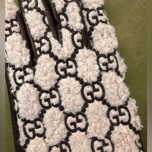 NEW WITH TAGS Gucci Brown supple leather lambskin with light white/very slight bone color /white shearling. Size 9. Gloves measure 10" Tip of middle finger to base of glove. These are Unisex. Fits a women's large/extra large or a men's mediium/large. Please measure your hand and see photos for measuremenmts. I am a women's medium with looong fingers and I have alot of room in these (thus selling as they are too big). Great gift and ready to be gifted with original tags in tact! Never worn. The brown is a very supple fine soft leather.