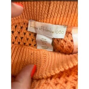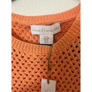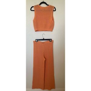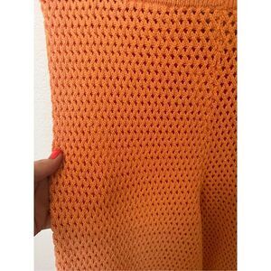 This House of Harlow pant and tank top set is perfect for this summer or your vacations. This is a knit crocheted tangerine color with some tiny sequence added throughout that are not noticeable except for sunlight. You can wear this as a swimsuit cover or an every day outfit