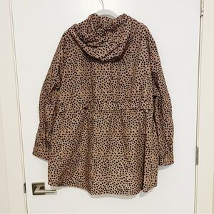 NWT J. Crew Perfect Rain Jacket in Leopard Dot Print. 100% machine wash polyester, unlined, attached hood, zip front wit snaps, snap cuffs, adjustable bungee cord waist. Zip chest pocket and 2 snap shut deep front pockets. Approximate measurements: Pit-to-Pit laid flat 26”, Length 30.5”, Sleeves 24” from shoulder seam. Smoke free home.