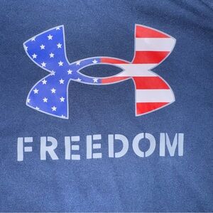 Under Armour Freedom hoodie in youth large (YLG). Features the bold American flag Under Armour logo across the chest and a soft, mid-weight fleece interior. Designed in a loose fit for everyday comfort.