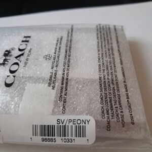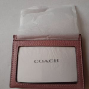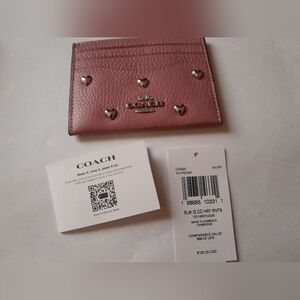 New Coach Card Case Wirh Silver Heart rivets It's about 4" by 3" Has 3 Card Slots on one side And ID Slot on the other with Middle Pouch.This is New With Tags .No Copy pics please. This is a Beautiful card case In Peony Color pink with Silver Heart Rivets .Would make a great gift .