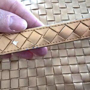 • Wear and finish loss to metallic coating on strap with creasing/minor cracking in small areas throughout (see close-up photos). Wear is cosmetic only, not very noticeable from a distance; strap is fully functional and detachable.