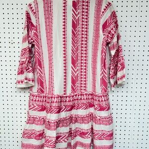 Chic mini dress with pink and white patterns. Features a relaxed fit and three-quarter sleeves. Perfect for casual outings.