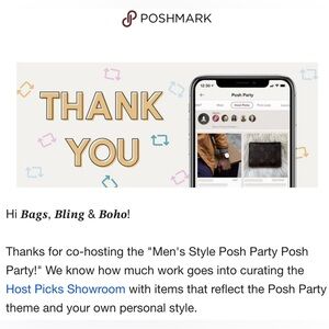@allnew2u2 Congratulations on cohosting today's Men's Style Posh Party. I hope you can take a moment to check out my posh-compliant closet for a potential host pick. All eligible listings are at the top of my closet. Thanks
