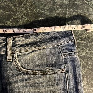 EUC American Eagle women’s denim mini skirt with distressed details. Features frayed hem and classic five-pocket design. Size 8, length and waist measurements in photos. All distressed features are how it was purchased, otherwise great condition.