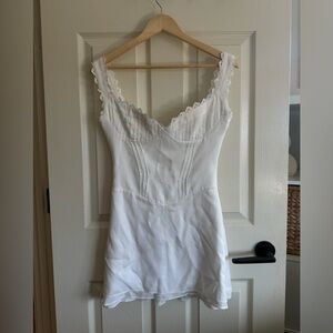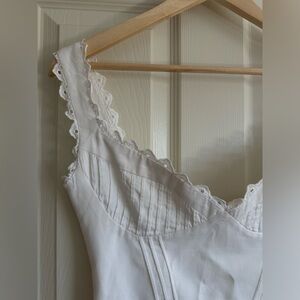 Elegant white dress with lace trim. Fitted bodice like a corset, and flared out at the hips. So flattering! Fits a size A-C cup — really great push-up action for the girls 🍈